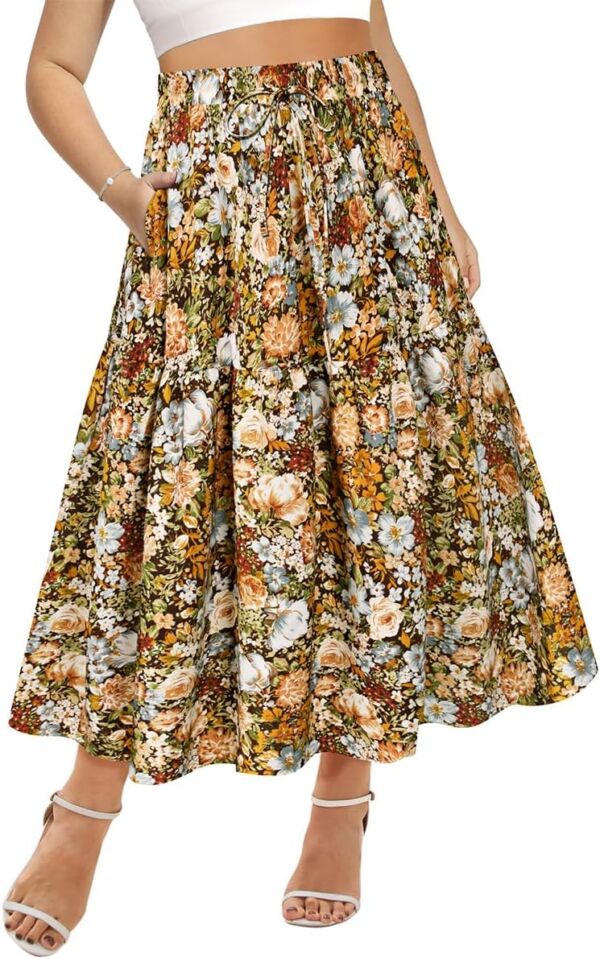 Plus Size Skirts for Curvy Women Elastic High Waist Boho Maxi Skirt Pleated A-Line Tiered Long Skirts with Pockets
