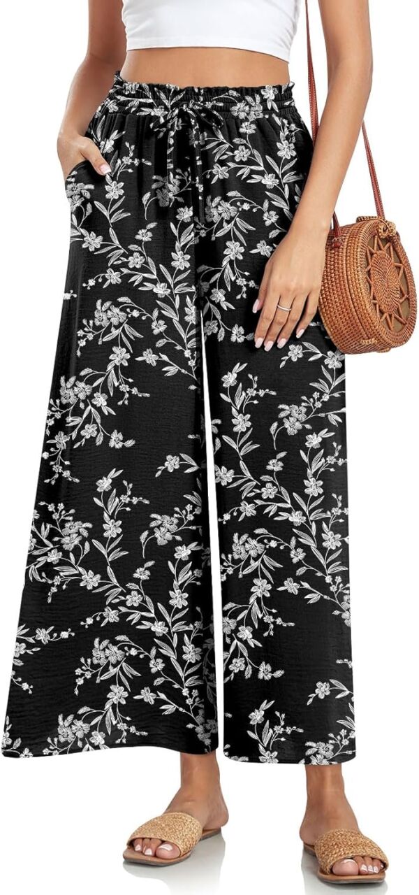 • Features: loose wide-leg design, elastic high-waist with drawstring, it’s a business-casual style, not see-through, it serves as cropped pants for women to cover up, and it’s a flowy and dressy style that is chic and comfy
